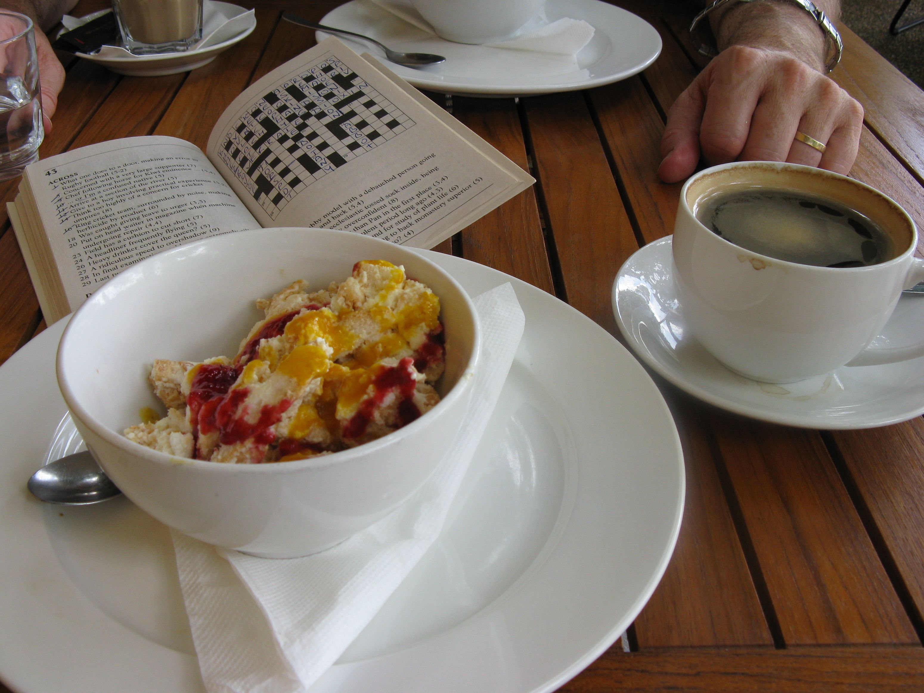 Book bloggers, and online bookgroupies, often talk about their penchant for never being without a book, so that if they find themselves suddenly stranded on their own – say, on a train or bus, or in a cafe, or in a doctor’s waiting room – they will not be bored, and I’m no different. I ALWAYS have a book with me. But, sometimes, I’m not quite stranded. Sometimes I’m with Mr Gums*, and my mother taught me that it’s rude to read in front of another person. So, what to do? There are, after all, only so many topics you can find to talk about when you spend a lot of time together. What we do – and have done since our dating days way back in the mid 1970s – is do cryptic crosswords together. And so it was that some weeks ago we found ourselves lunching at the Pialligo Estate Winery. We’d had a good chat over lunch and consequently decided over our coffee and dessert to bring out the crossword book and voilà, the photographic evidence. Oh, and the cake, actually an interpretation of Eton Mess, was delicious, but in deference to Desert Book Chick I’ll not wax any more lyrically than that.