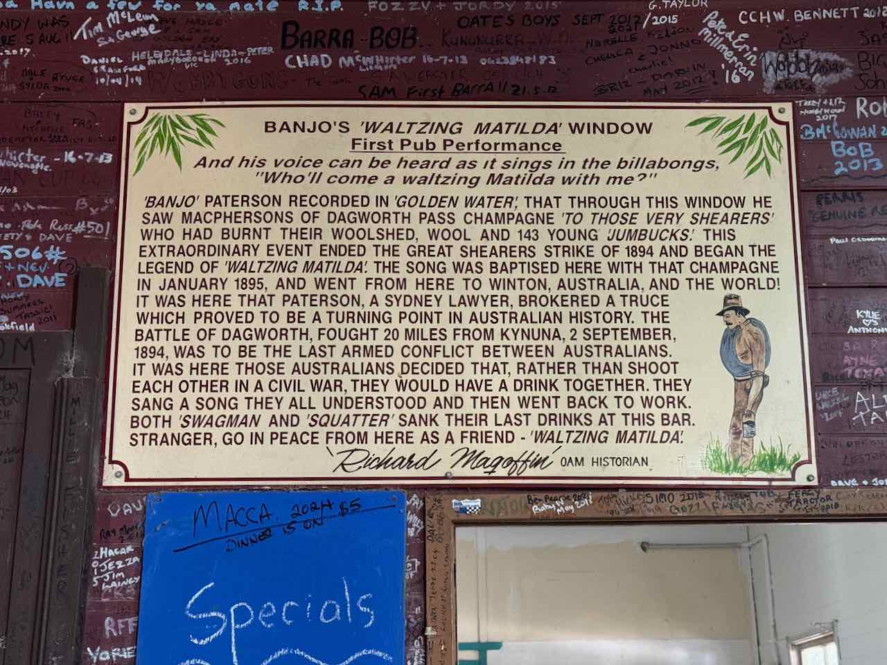 Dagworth (sheep station), Kynuna and Winton: AB “Banjo” Paterson’s poem and song “Waltzing Matilda” was written and first performed in this region around 1894 to 1895, though details seem to vary a little about which verses were written where, where it was first performed, its inspiration in characters of the region, and Banjo’s role in the 1894/95 Shearer’s Strike.