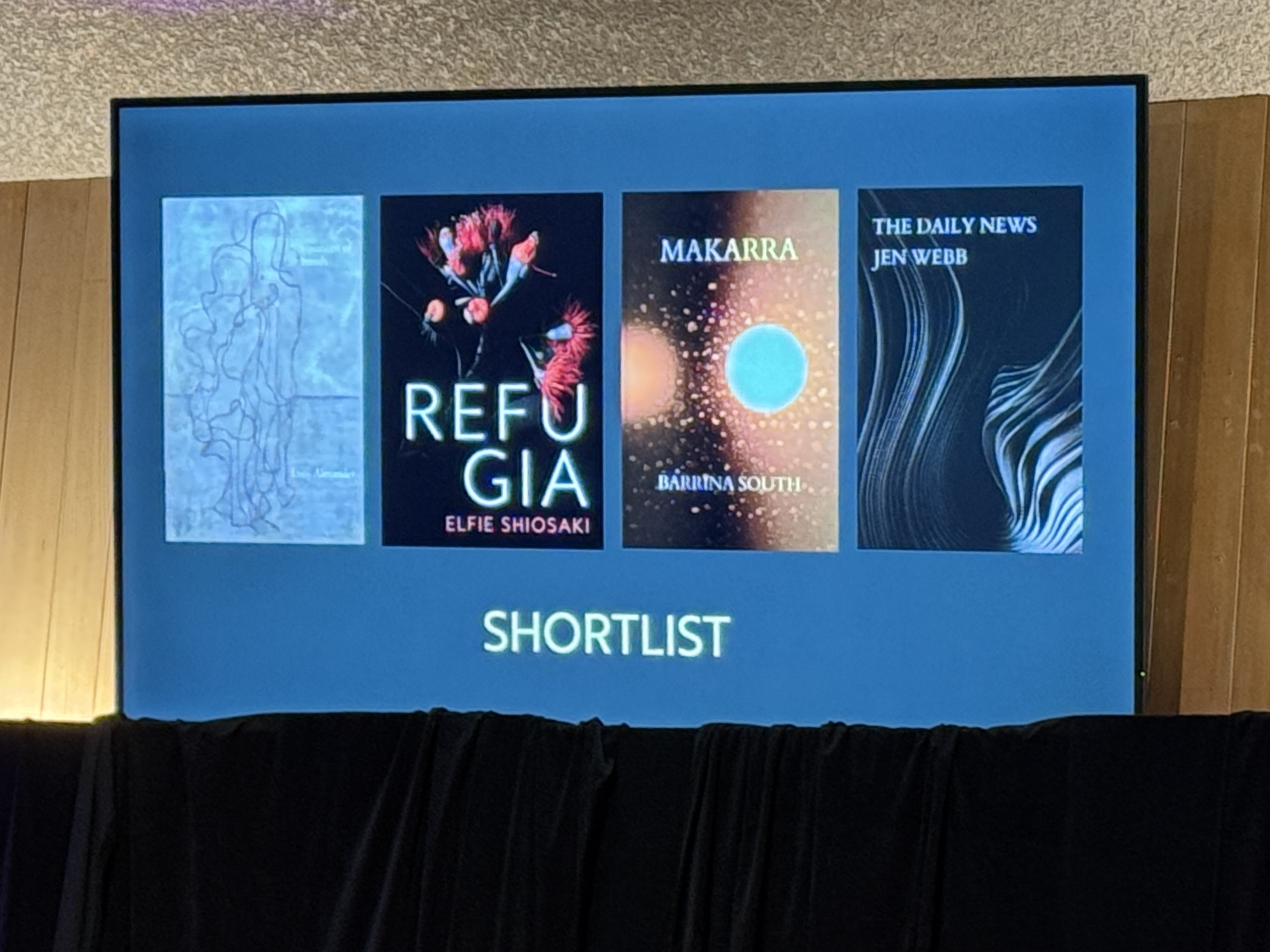 Canberra (the ACT) is a small jurisdiction, but, as I wrote last year, it has an active, engaged and warm literary community, encompassing writers across all forms and genres, of course, but also publishers, booksellers, sponsors, arts administrators, academics, journalists, and more. All were well in evidence despite the chilly july evening. We were also treated during the evening to a reading of the winning Finding Beauty poem by the poet Alisha Brown, a short performance by local slam poet Andrew Cox, and a video greeting complete with entertaining poem from the travelling-Craig Cormick (my posts) who was one of the originators of Marion 30 years ago.