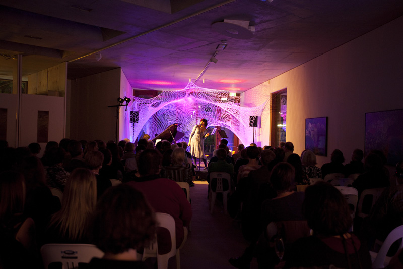The event took place in an intimate venue in Canberra’s newest inner city precinct, New Acton, which, I understand, is positioning itself as an arts hub. Even before a fire in mid-2011 set the area back, there had been some lovely musical evenings in Flint, one of the precinct’s restaurants. The Nishi Gallery, though, is a very recent player on the block, so recent that I’m not quite sure what its long-term plans are. Last night, however, it became a delightful space in which a gathering of, guessing here, about 100 people heard three great authors read from their works, bookended by music (mostly) chosen by them and performed by local professional musicians. It was, in a word, a blast.