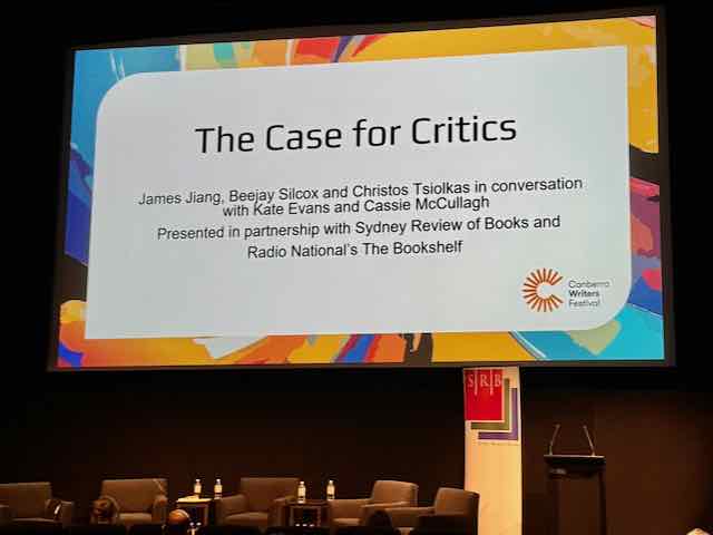 Cassie did the acknowledgment of country. The participants were introduced – author Christos Tsiolkas (who has appeared several times on my blog), Editor of the Sydney Review of Books James Jiang, and critic and Canberra Writers Festival Artistic Director Beejay Silcox. Then the discussion commenced. I considered using my usual headings approach but the discussion was so engaged and free flowing, that I decided breaking it up would lose some of the connections. So, I’ve bolded a few ideas here and there as a guide. And, I’ve put my own reflections in parentheses.