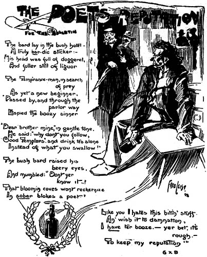 In the 1890s, according to a 1934-written reminiscence by “Stockwhip”, Holt travelled with Henry Lawson. “Stockwhip” describes him as ‘the jocular writer and “charcoal” artist, Dick Holt” and says he was “a well-known writer to the Sydney Bulletin and Western Herald of Bourke”. He had his own newspaper column “On the Wallaby”. This title references the phrase “on the wallaby track”, which is Australian slang for travelling from place to place looking for work, which is exactly what he and Lawson were doing in Stockwhip’s anecdote. His columns, at least those I’ve seen, ran anywhere from 1500 to 3000 words, and tended to comprise a collection of anecdotes.